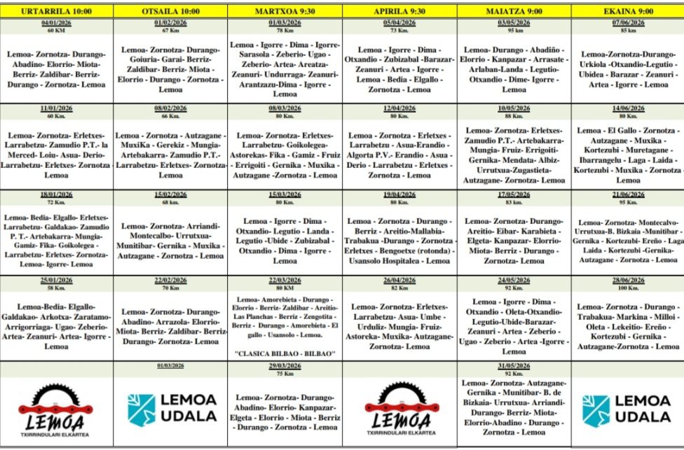 Durante los primeros meses de la temporada se realizarán salidas por los diferentes bidegorris y pistas forestales cercanas a Lemoa, así como entrenamientos en el circuito de Mountain Bike (Skill Park) y Pump Track.