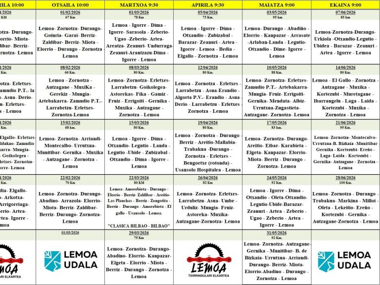 Durante los primeros meses de la temporada se realizarán salidas por los diferentes bidegorris y pistas forestales cercanas a Lemoa, así como entrenamientos en el circuito de Mountain Bike (Skill Park) y Pump Track.